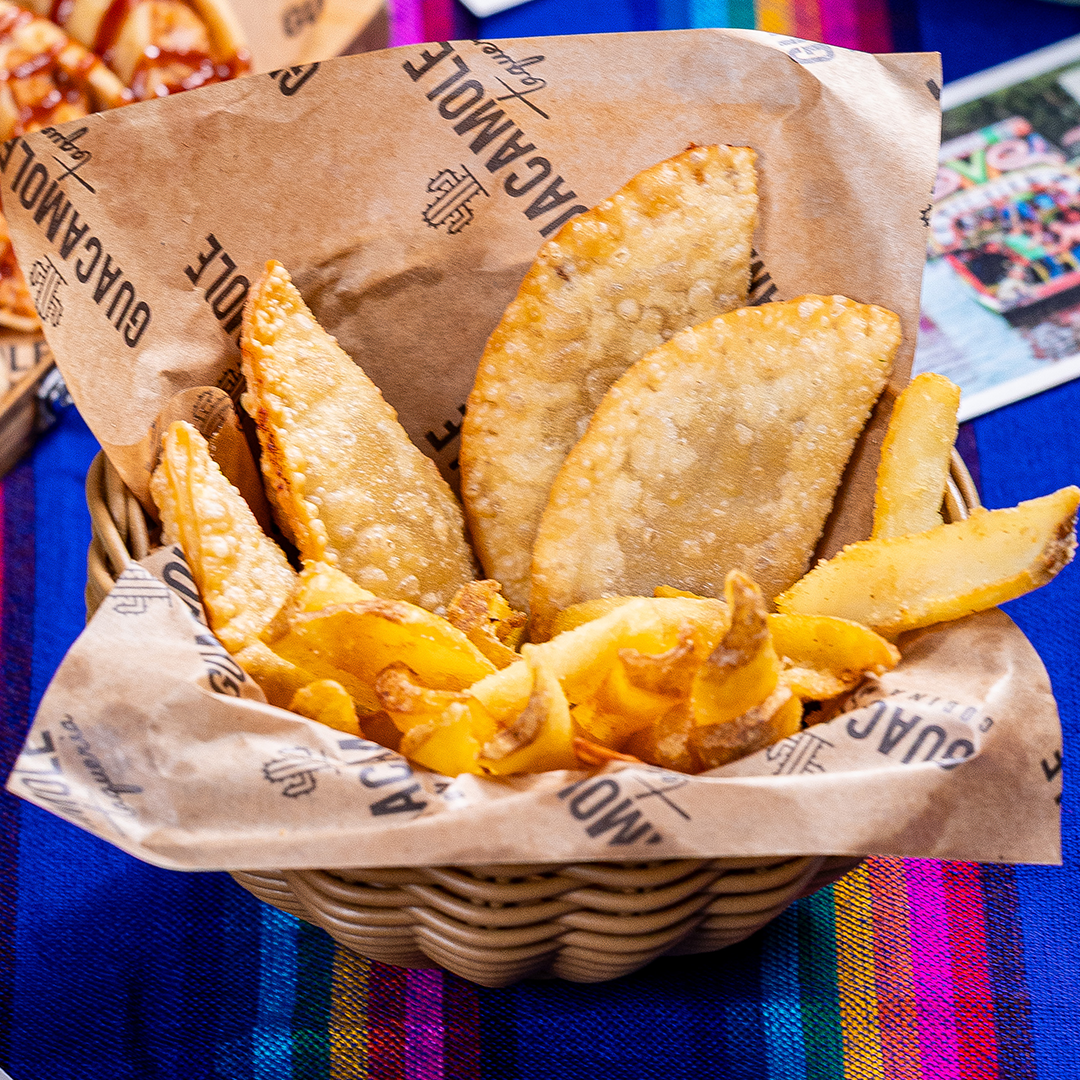 Batata frita canoa acompanhada de mini pastéis de chili e molho barbacoa.