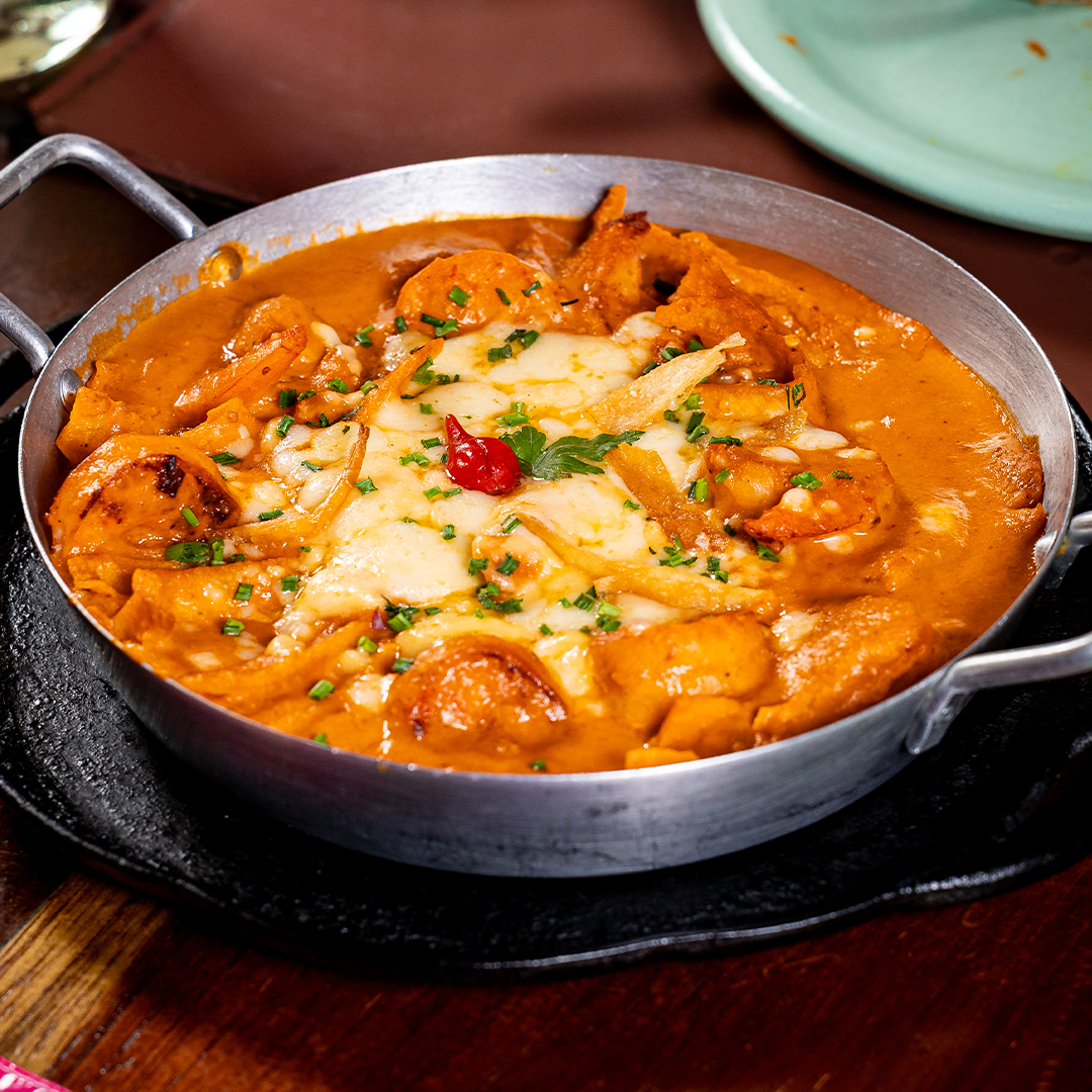 Camarões selados, tiras de tortilla crocante, molho de salsa picante com sour cream, com mix de queijos e pimenta biquinho.