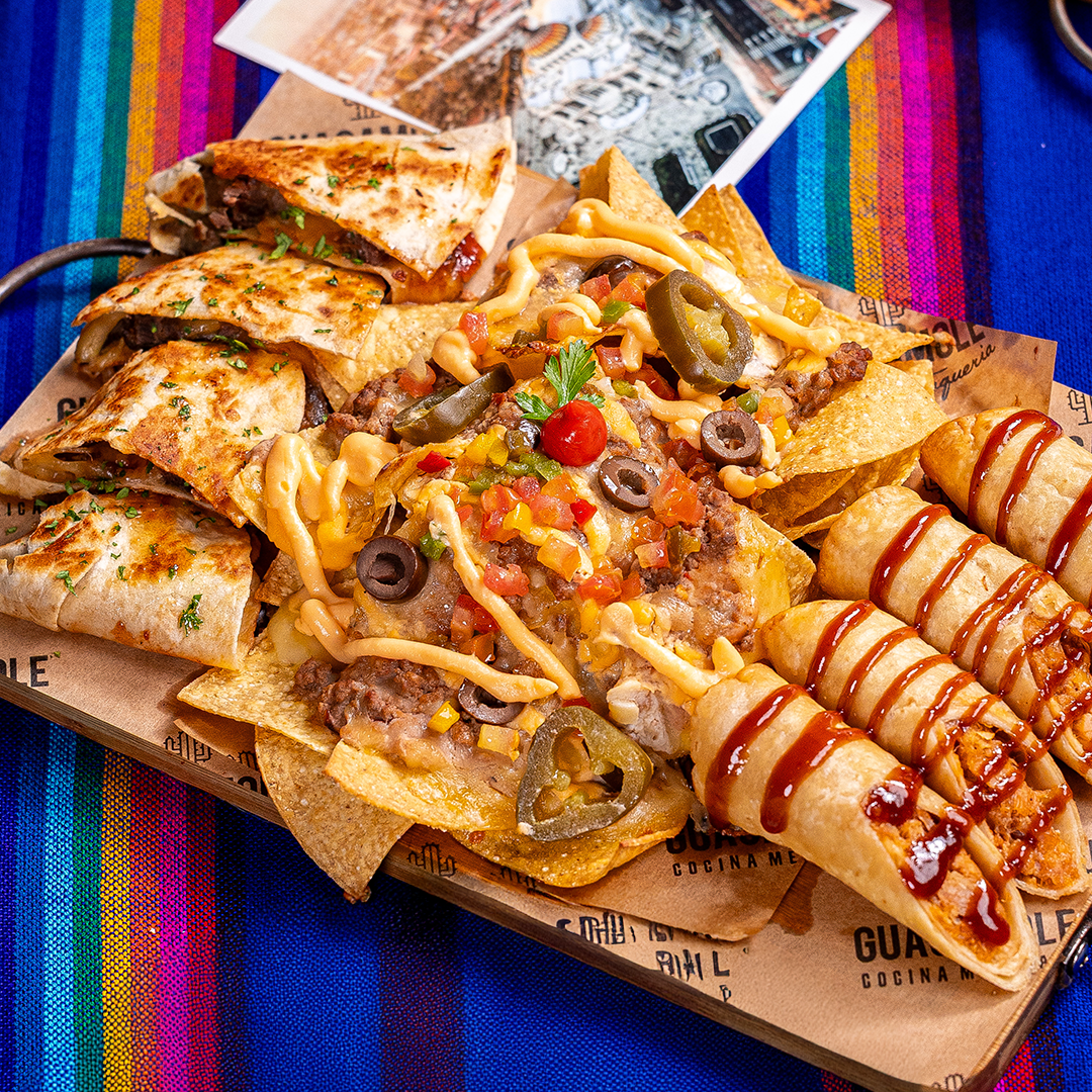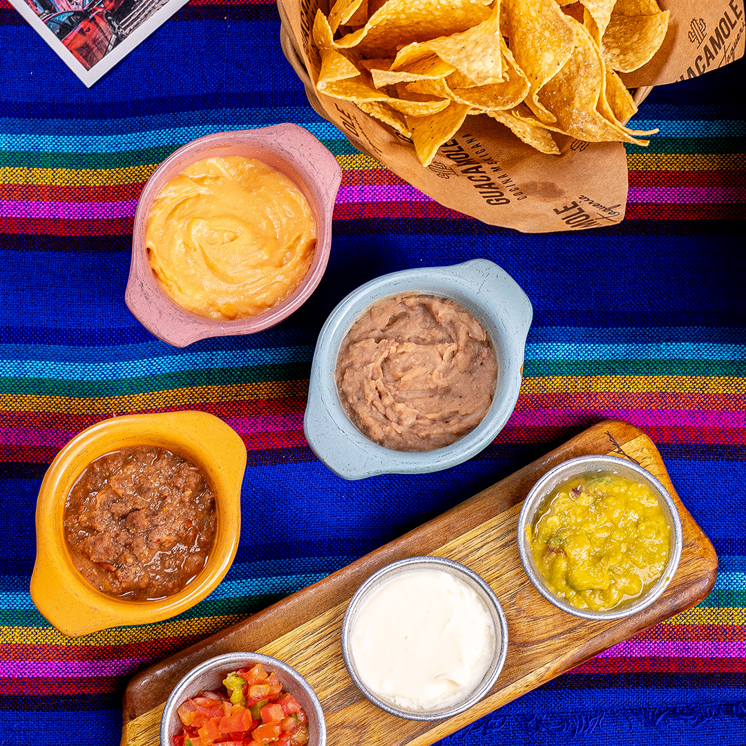 Cesta de chips fritos servida com trio frio de guacamole, pico de gallo e sour cream, além de trio quente com cheddar, frijoles e chili.