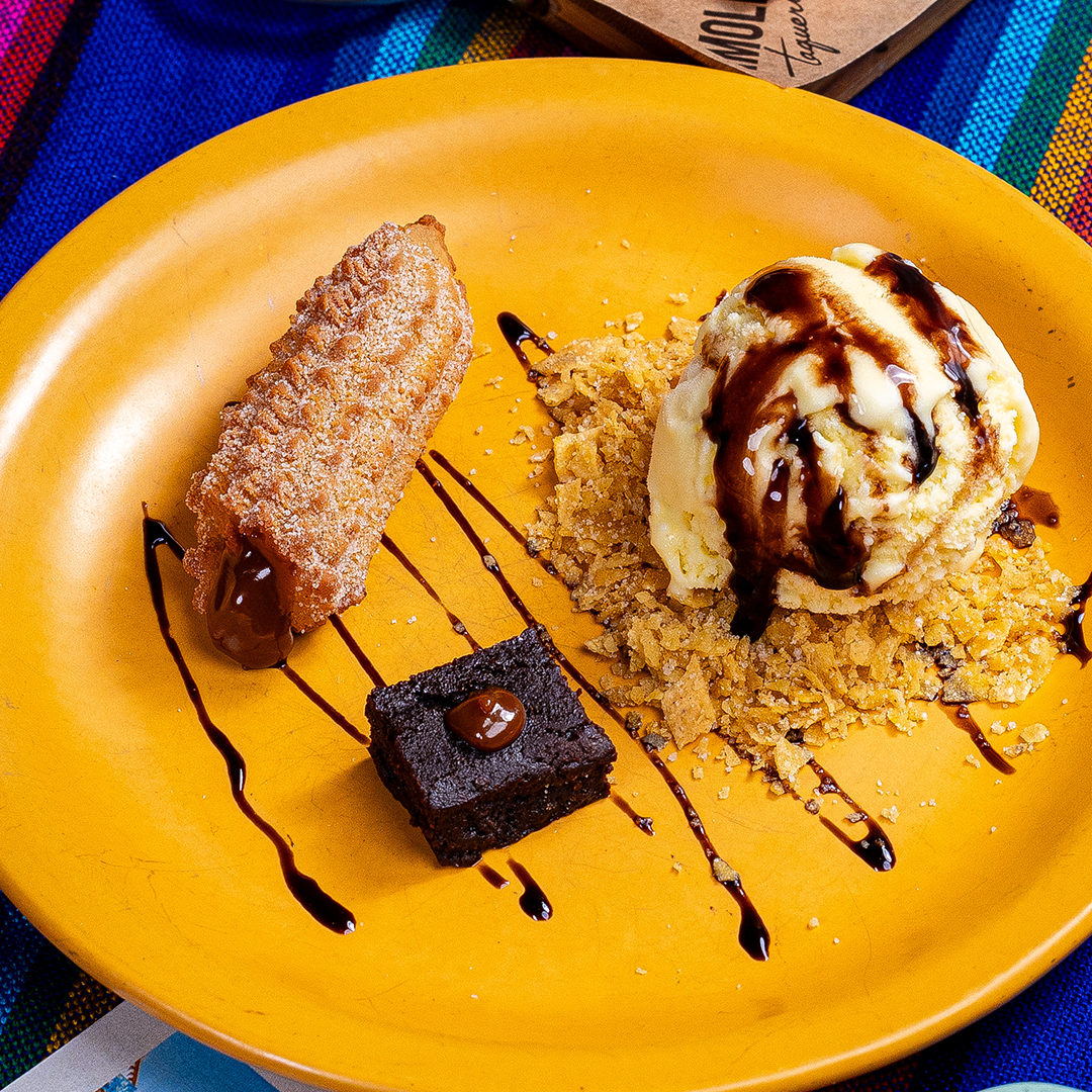 Churros recheado com doce de leite, brownie e sorvete de creme com calda de chocolate para finalizar.