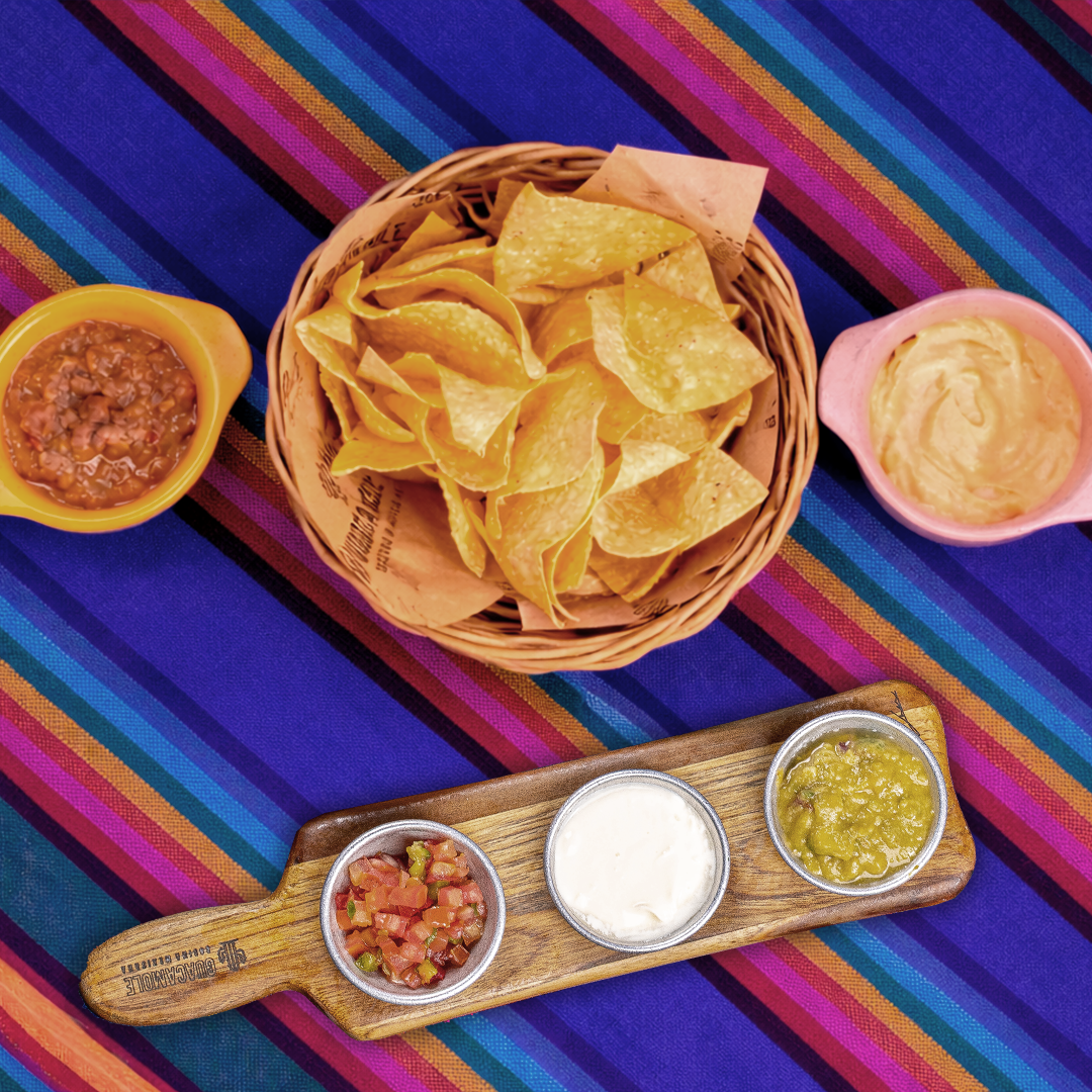 Cesta de chips fritos servida com trio de molhos de guacamole, pico de gallo e sour cream, além de cheddar e chili.
