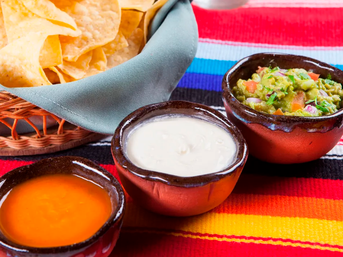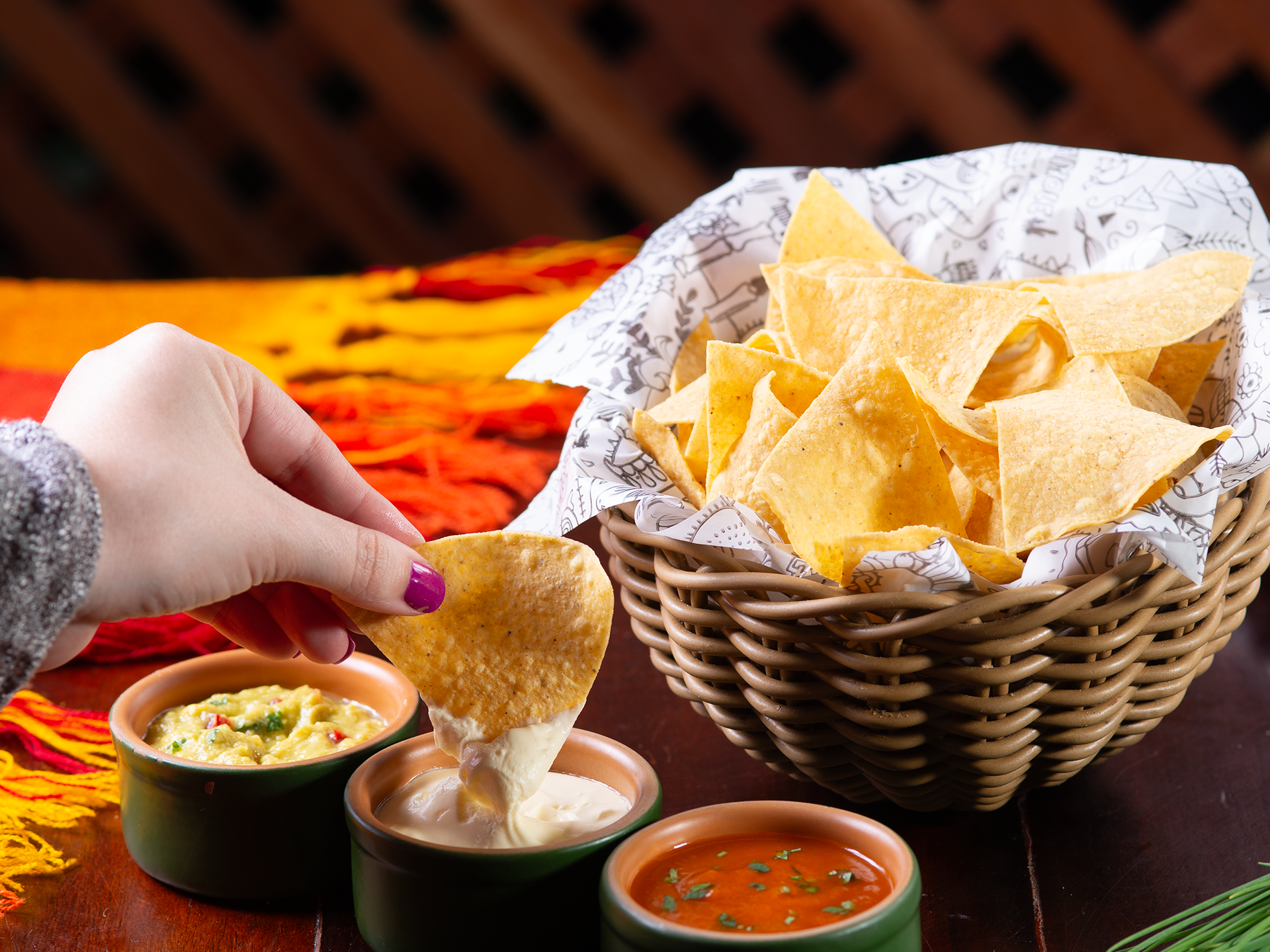 Porção de tortillas de milho crocantes servida com guacamole fresco, pico de gallo e salsa picante, perfeitos para começar a refeição.