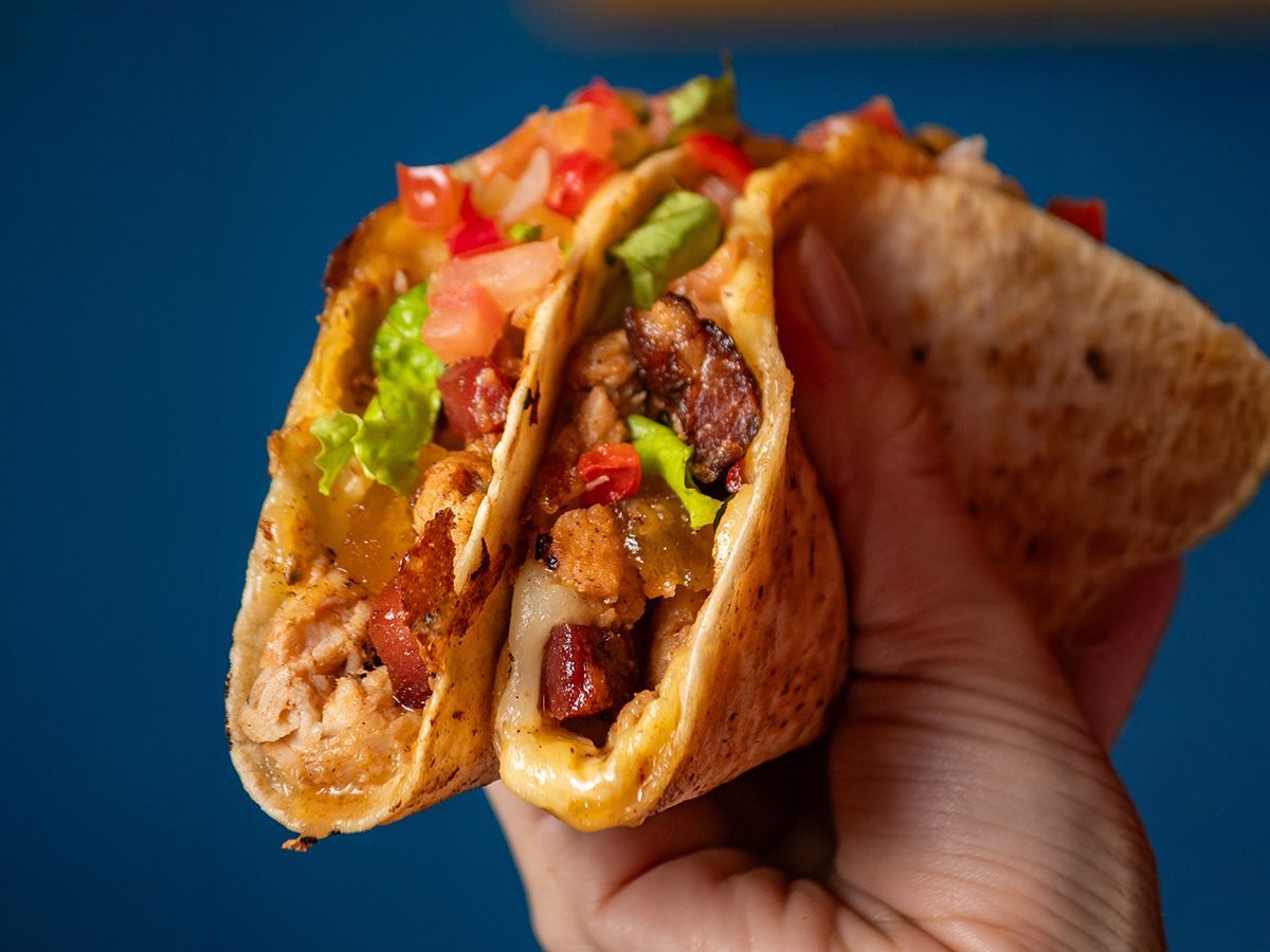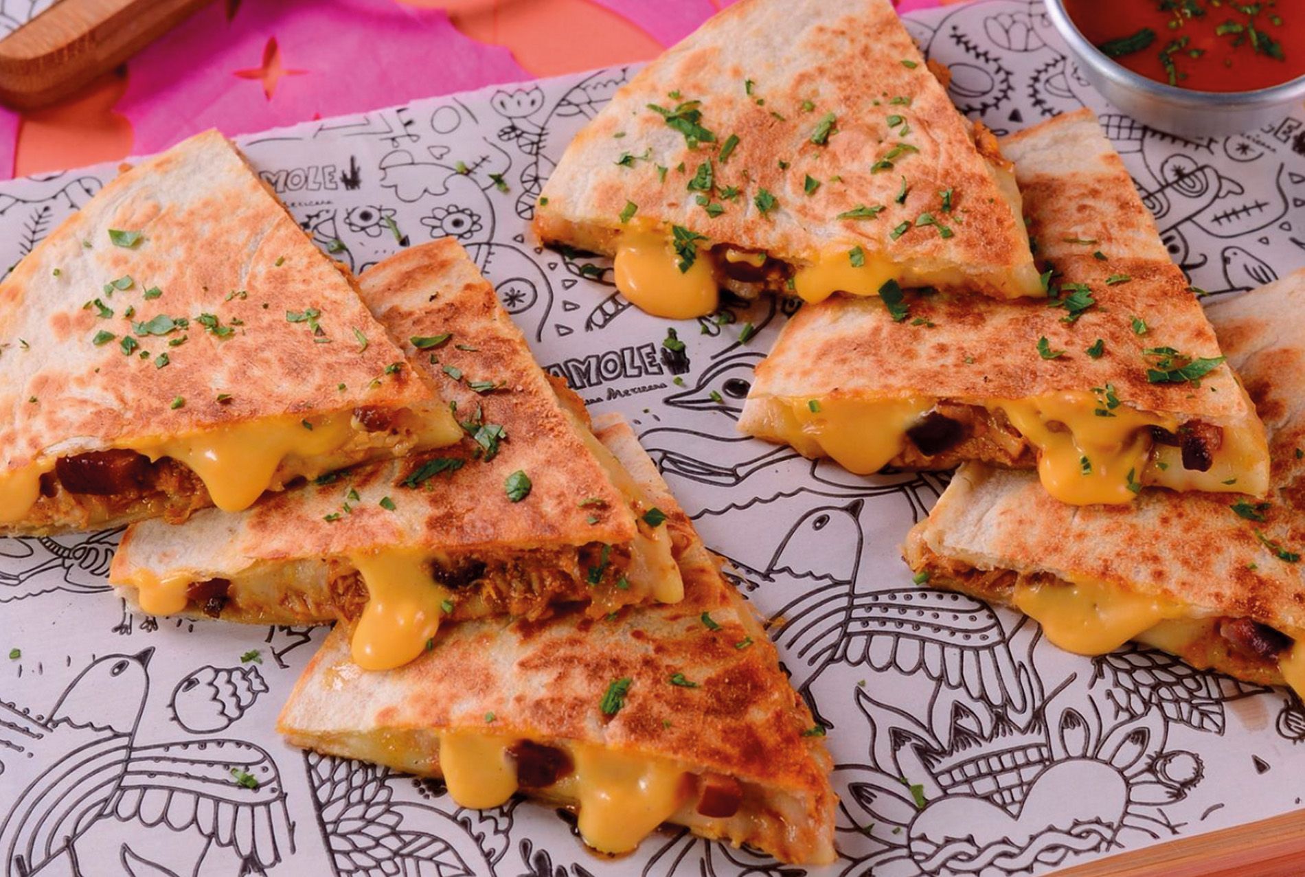 Quesadilla Pollo Loco - Duas tortillas tostadas na chapa recheada com frango desfiado, queijos derretidos, pedaços de bacon perfeitamente tostados e finalizado com queijo cheddar.
