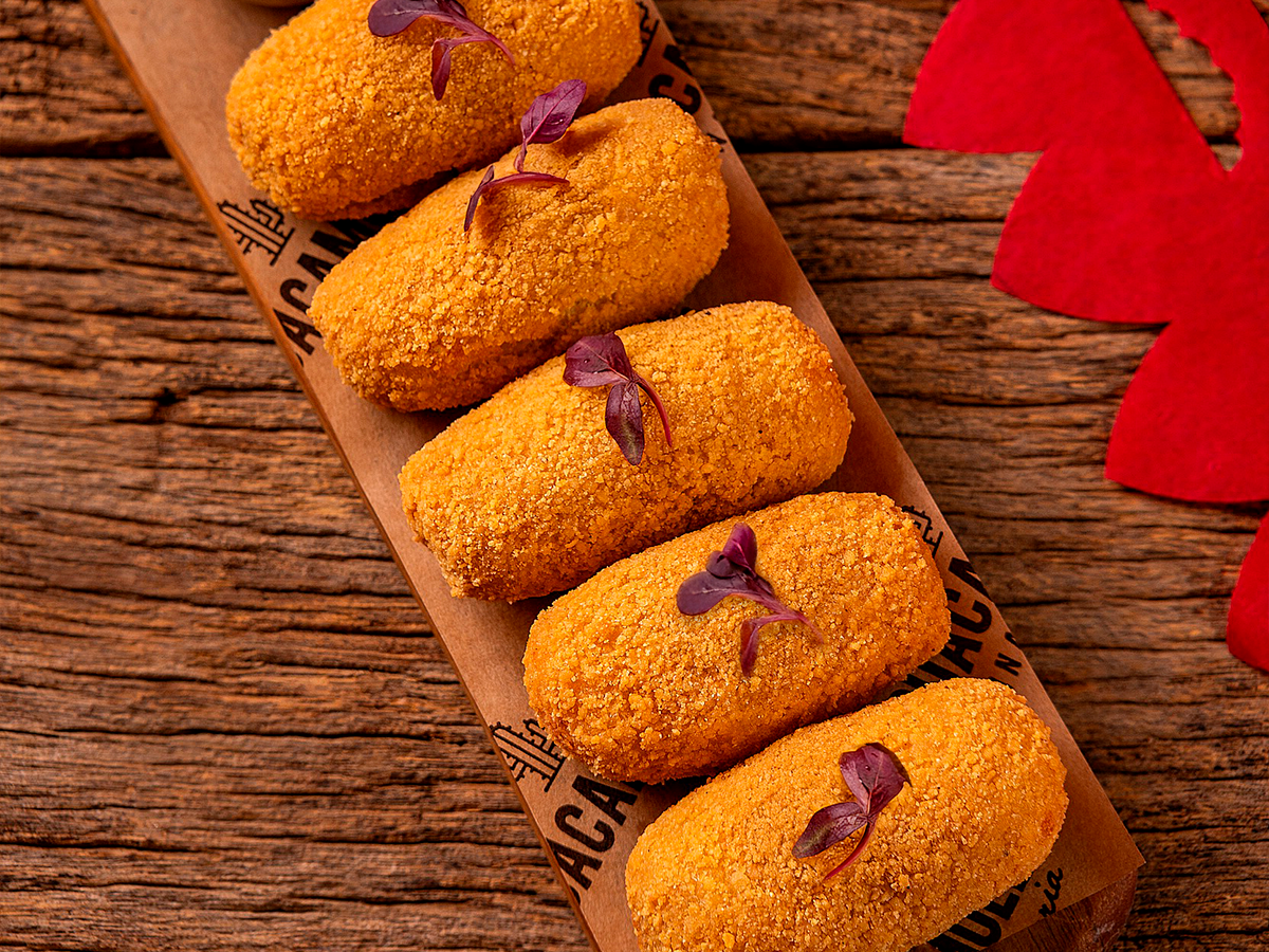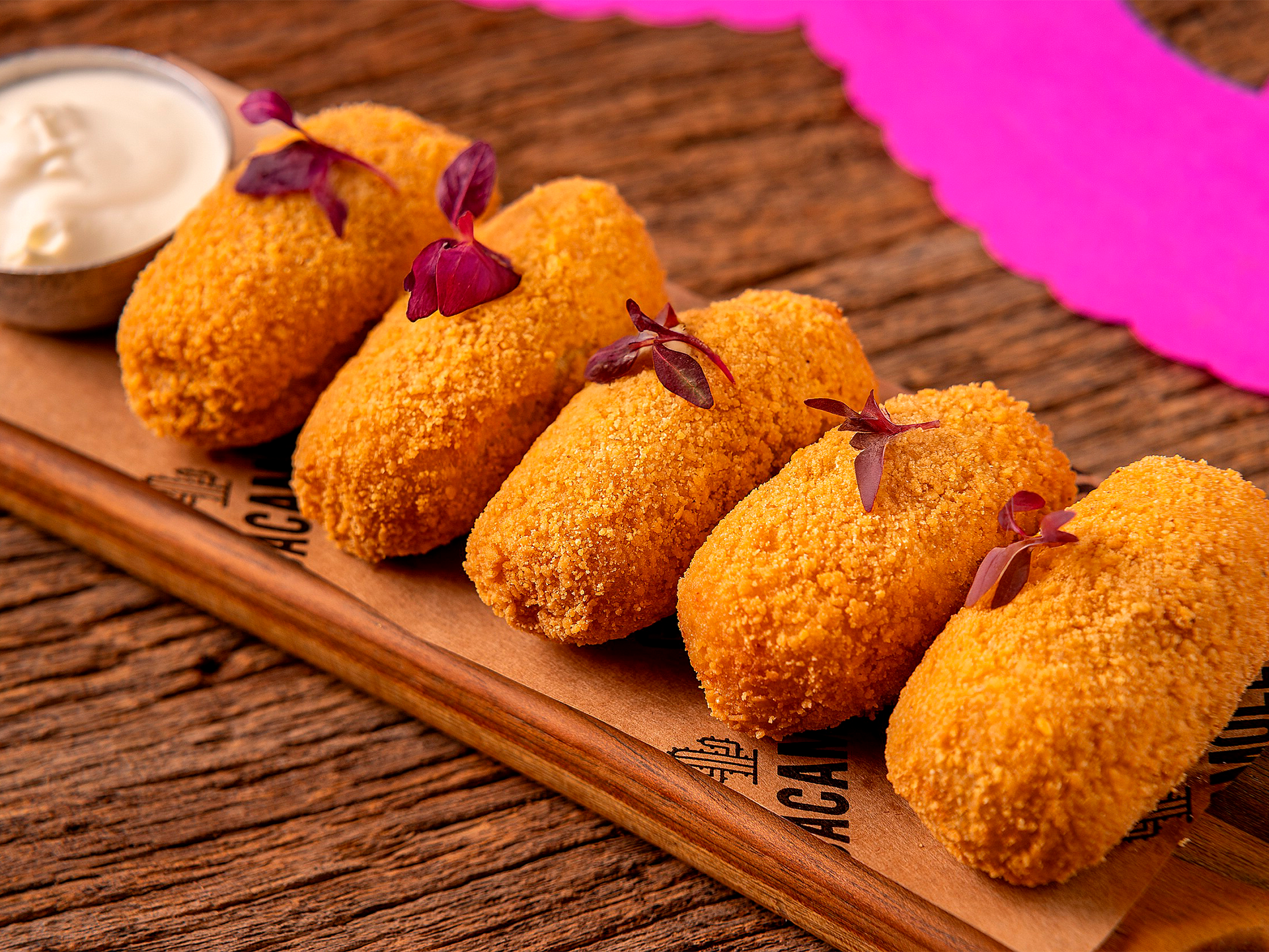 Croquetes de massa de milho recheados com carne seca mexicana temperada com jalapeño, empanados em farelo de tortilla crocante e servidos com sour cream.