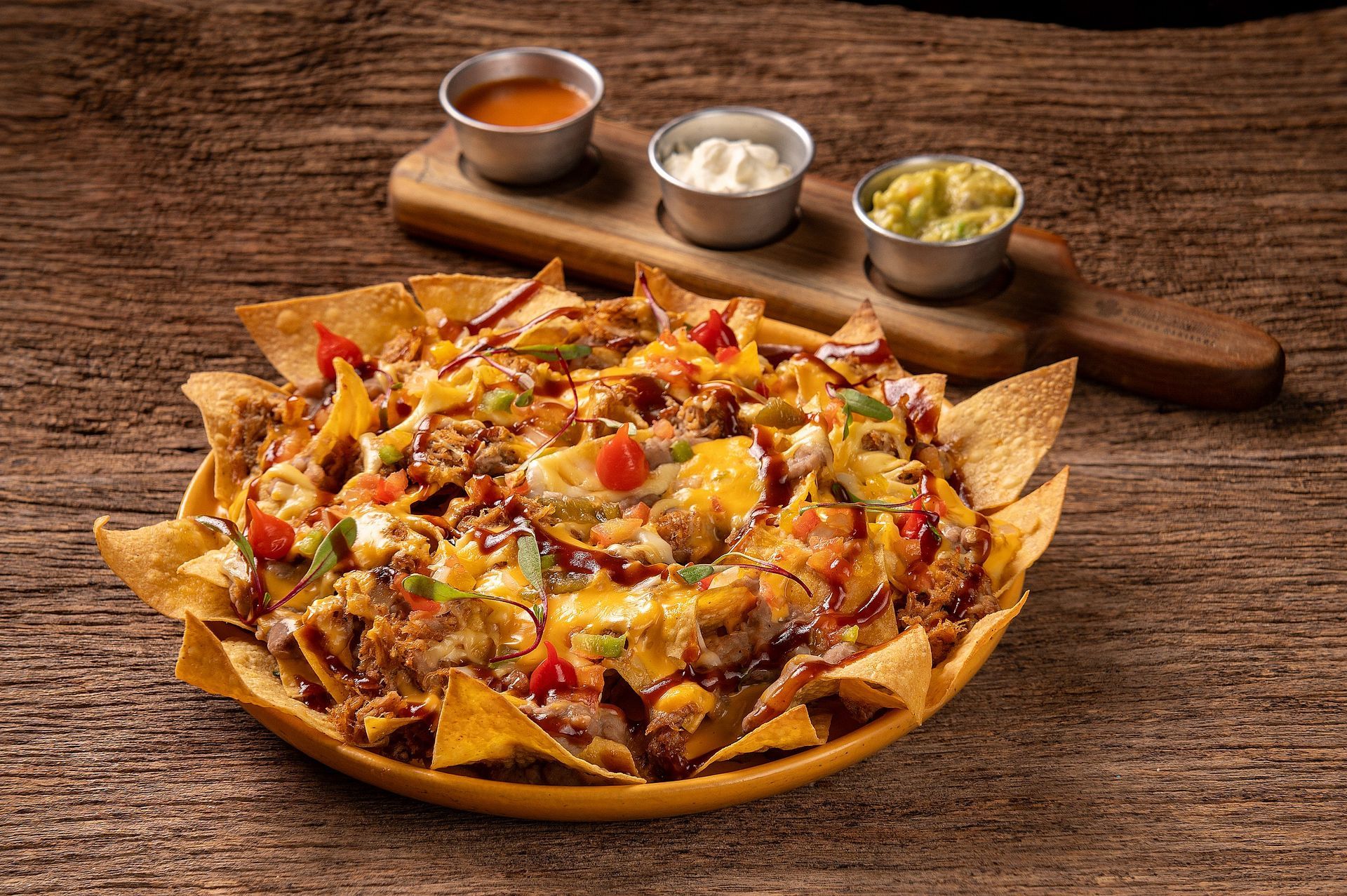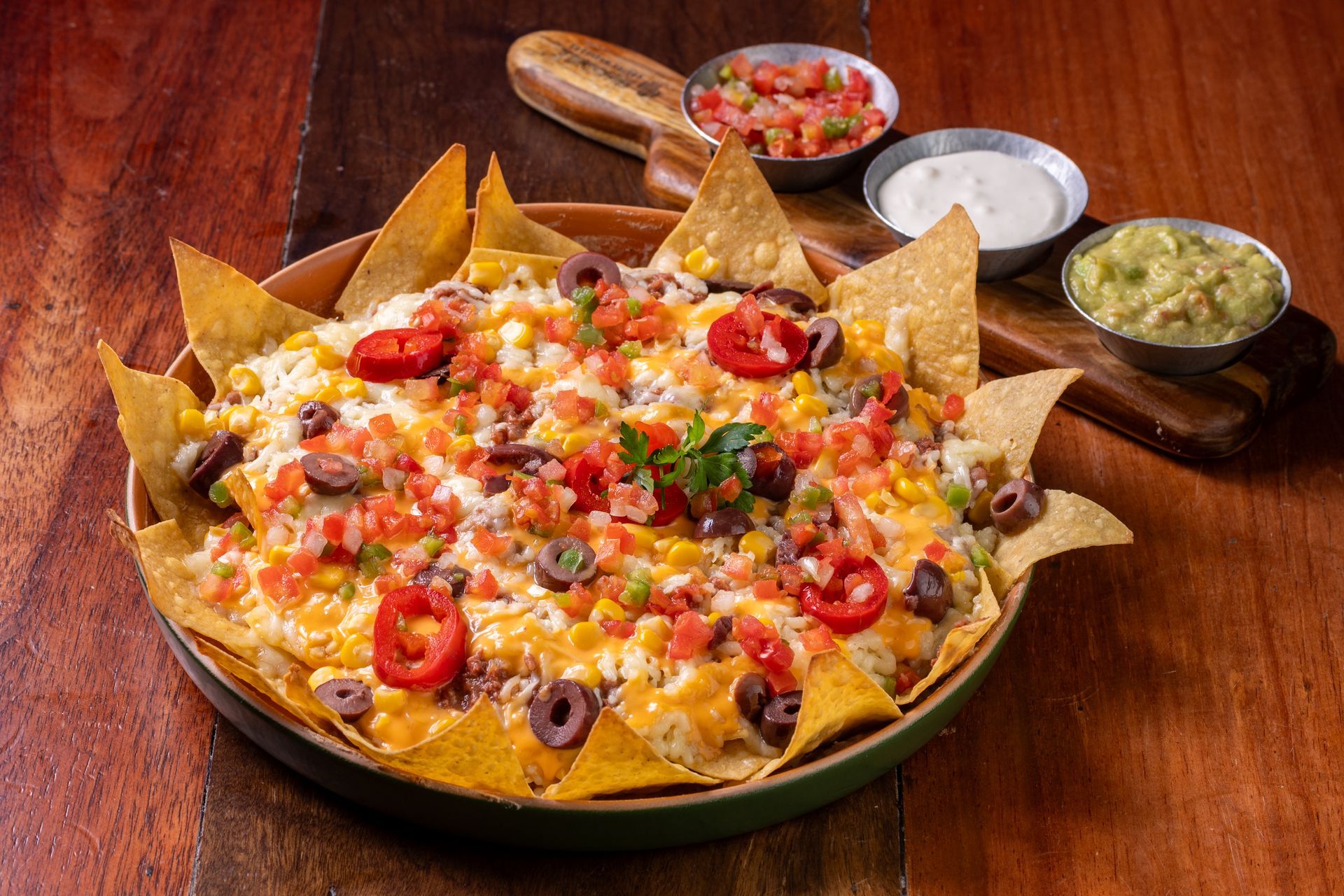 Jalisco - Tortillas de milho crocantes cobertas com frijoles, chili de carne bovina, mix de queijos gratinados e molho cheddar. Acompanha trio de molhos: guacamole, pico de gallo e sour cream.