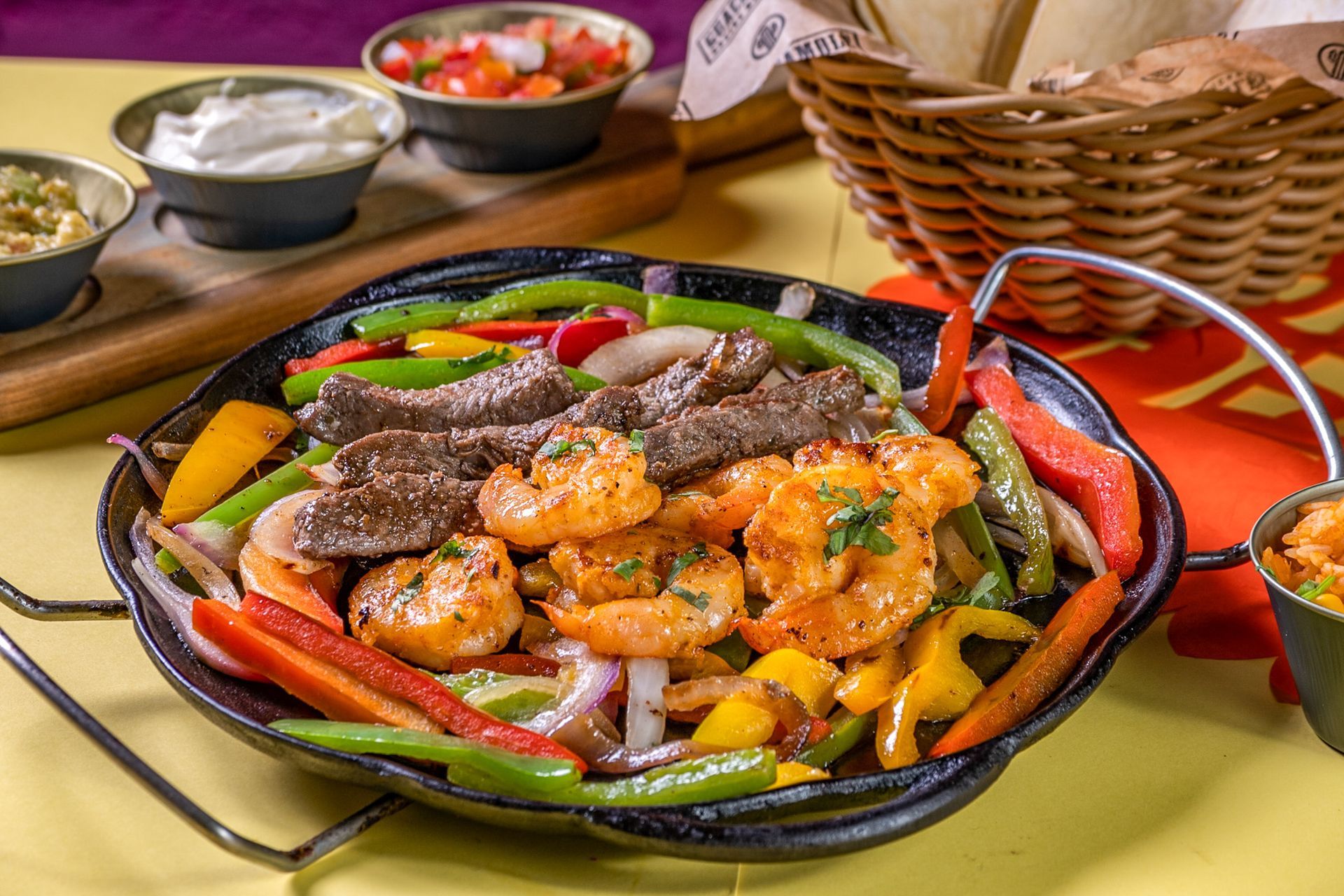Tiras de filé mignon e camarões flambados na taquila em uma cama de pimentões e cebolas, servidas na chapa. Acompanha cesta de tortillas de trigo tostadas, arroz mexicano, frijoles, guacamole, pico de gallo e sour cream.