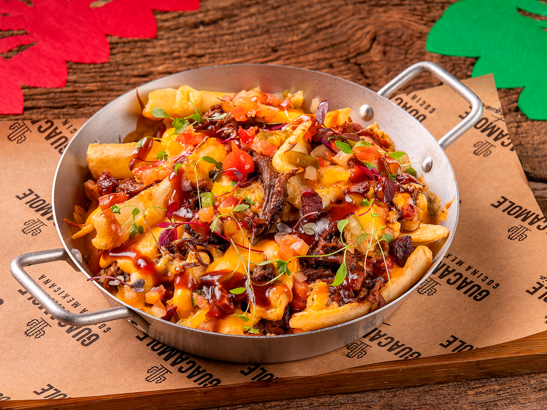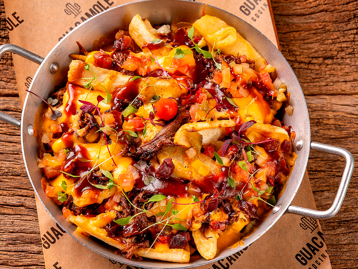 Batatas canoa fritas cobertas com uma suculenta carne cozida com especiarias mexicanas, molho cheddar, bacon crocante, barbacoa artesanal e pico de gallo levemente picante.
