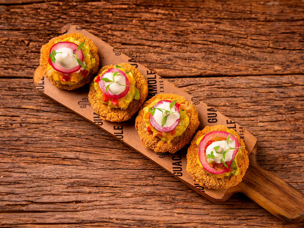 Bolinho crocante de feijão mexicano, empanado no farelo de tortillas crocantes, coberto com guacamole, nosso pico Xni-Pec de leve picância, finalizado com sour cream e picles de cebola roxa.