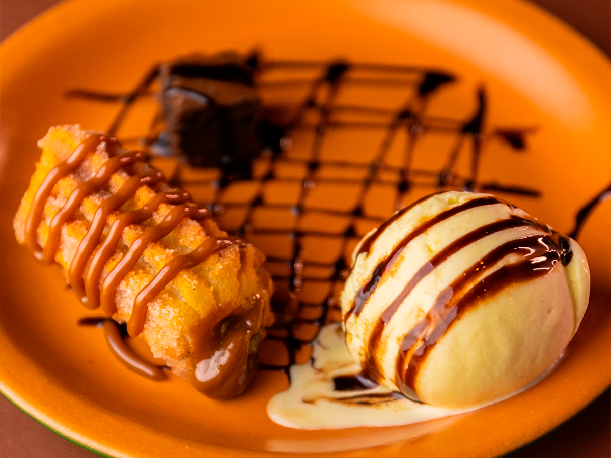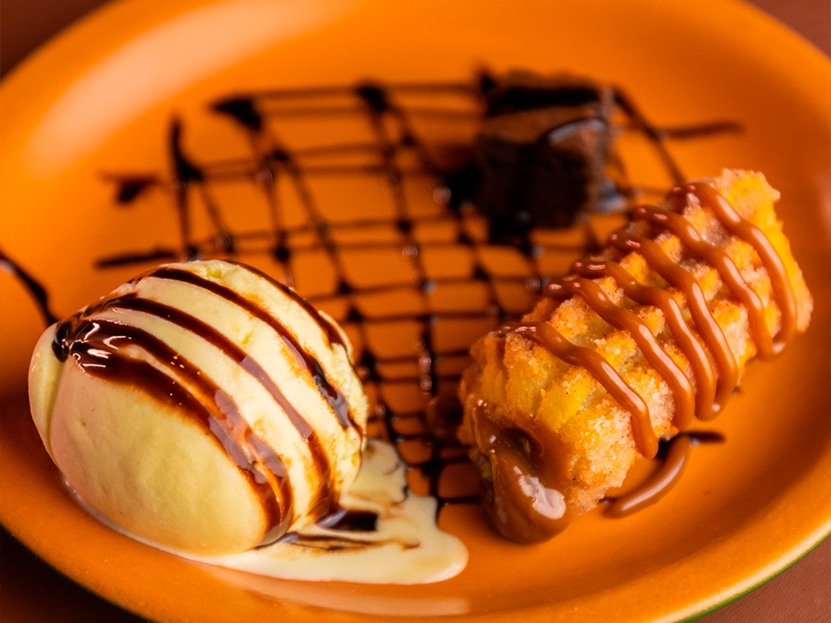 Churros crocantes, recheados com doce de leite cremoso, servido com sorvete de baunilha, brownie e finalizado com uma generosa calda de chocolate.