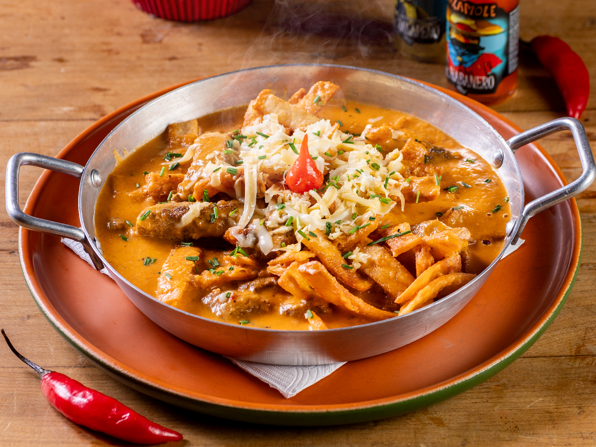 Chilaquille de Frango com Creme de Salsa Picante – Tiras de frango grelhadas combinadas com um creme aveludado de salsa picante. Essa mistura é delicadamente disposta sobre uma cama de tortillas de milho quentinhas que absorvem o molho e completam a suculência do prato.