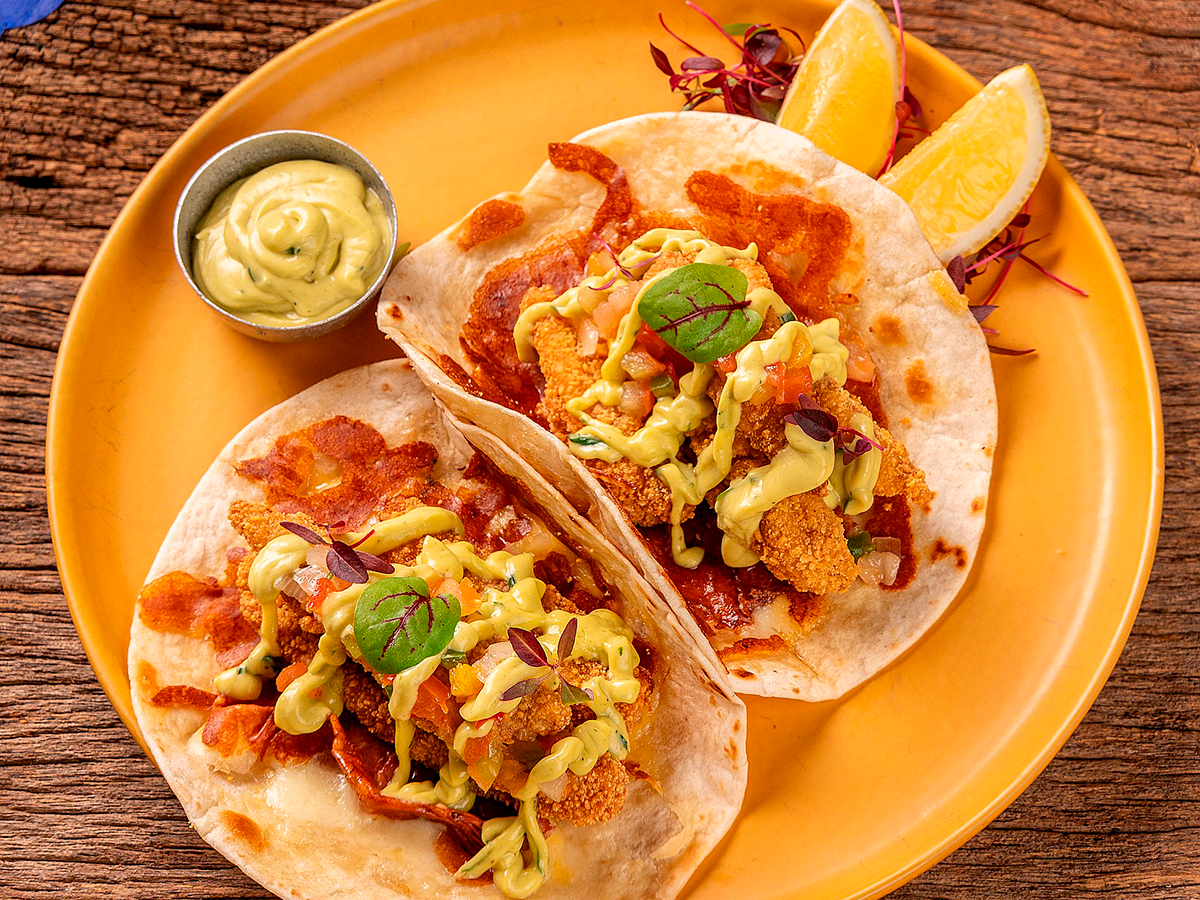 Taco Al Pastor - Tortilla de trigo dourada na chapa, coberta com uma crosta de queijo, recheada com peixe empanado em chips de milho crocante, finalizada com pico de gallo levemente picante e maionese de abacate. Acompanha maionese de abacate.